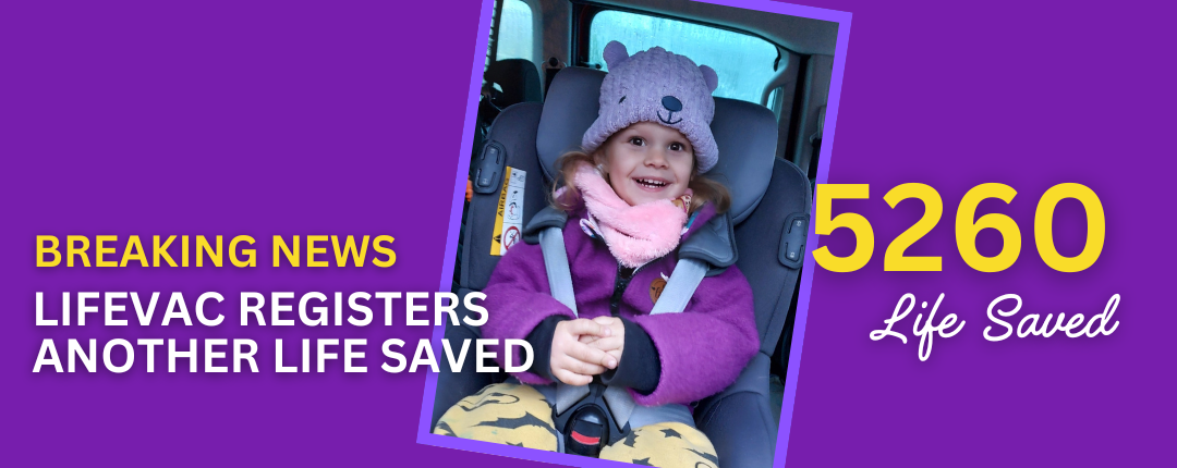 Leia put a toy in her mouth which slid down causing a completed airway obstruction. Her quick thinking mother performed first aid choking rescue techniques which could not dislodge the airway obstruction. Nicole then grabbed her LifeVac device and applied it to Leia while she was in a supine position. On the 3rd application LifeVac dislodged the toy saving Leia’s life.